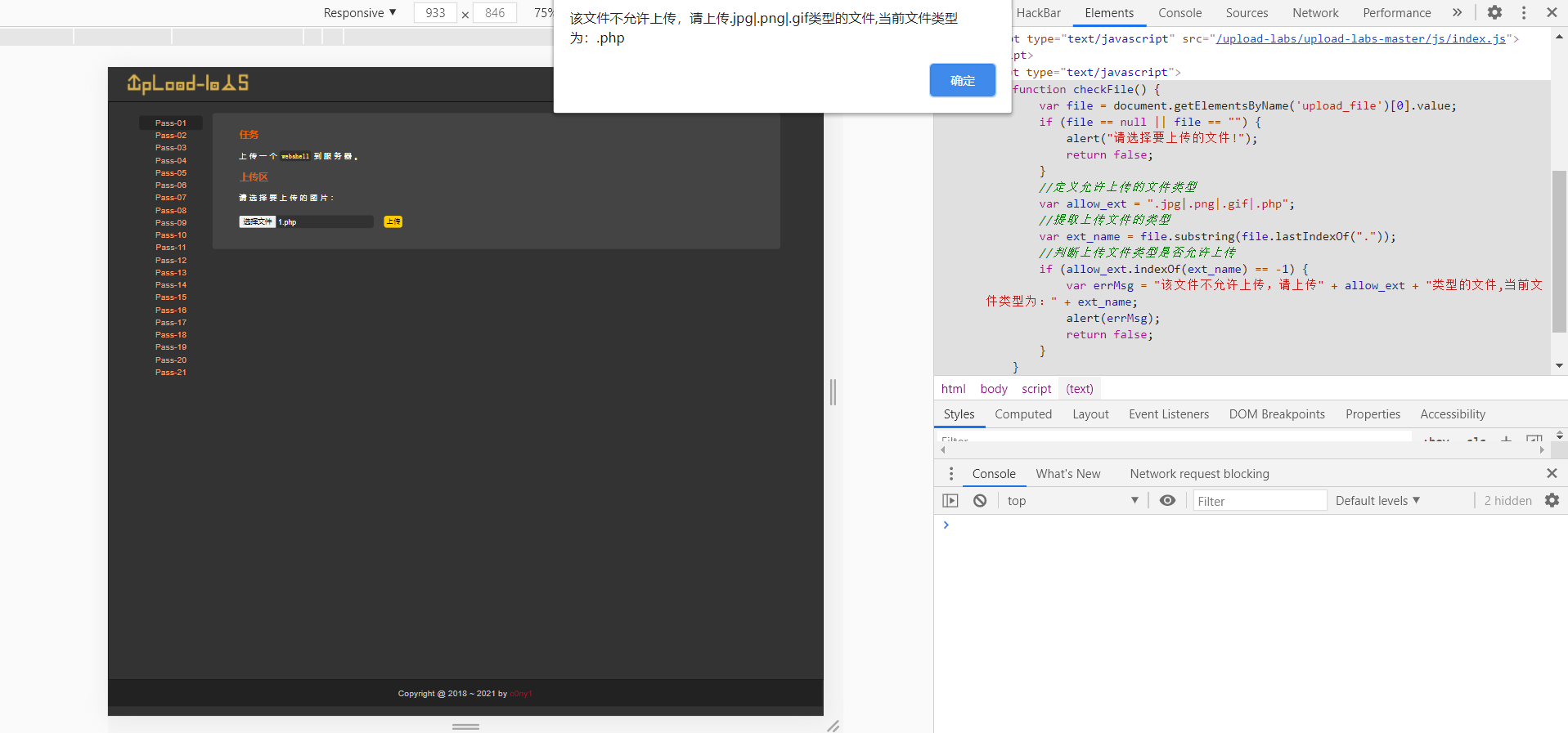 绕过explode()函数:传入数组,绕过白名单,由于取的是数组最后一个,所以传入数组的最后一个要为jpg|png|gif,然后拼接文件名,取reset()第一个,即索引为0,和索引count()-1(数组内元素个数-1)。所以索引0应为.php,索引3为jpg(索引1之后即可),这样数组元素个数为2,拼接的就是索引0和索引1即.php和空,结果还是.php