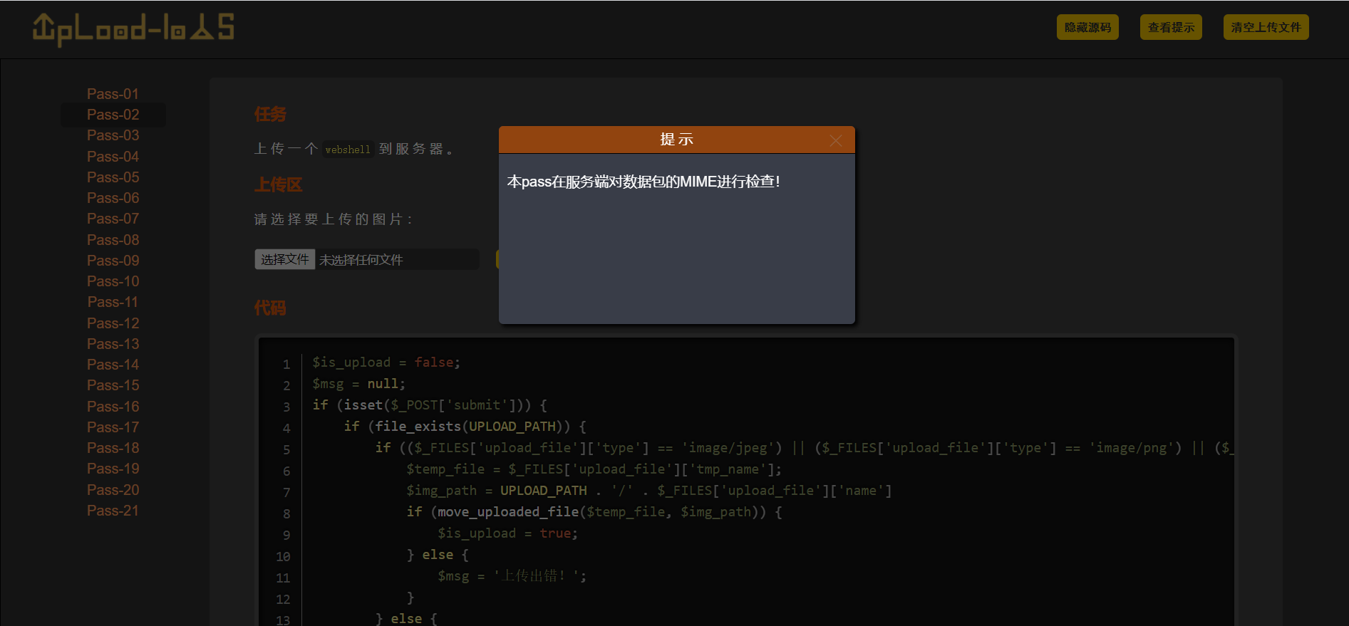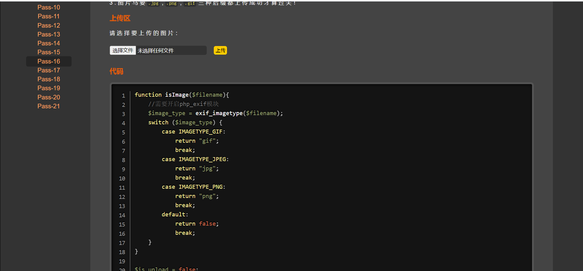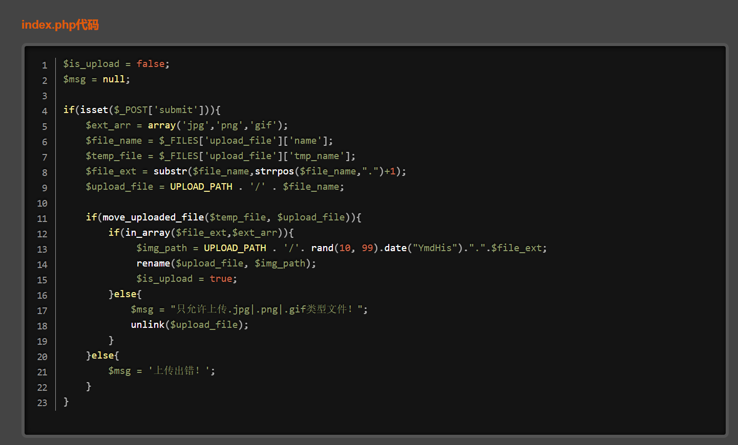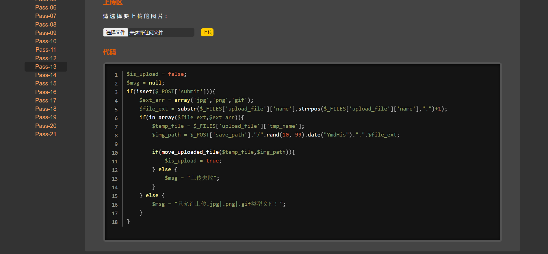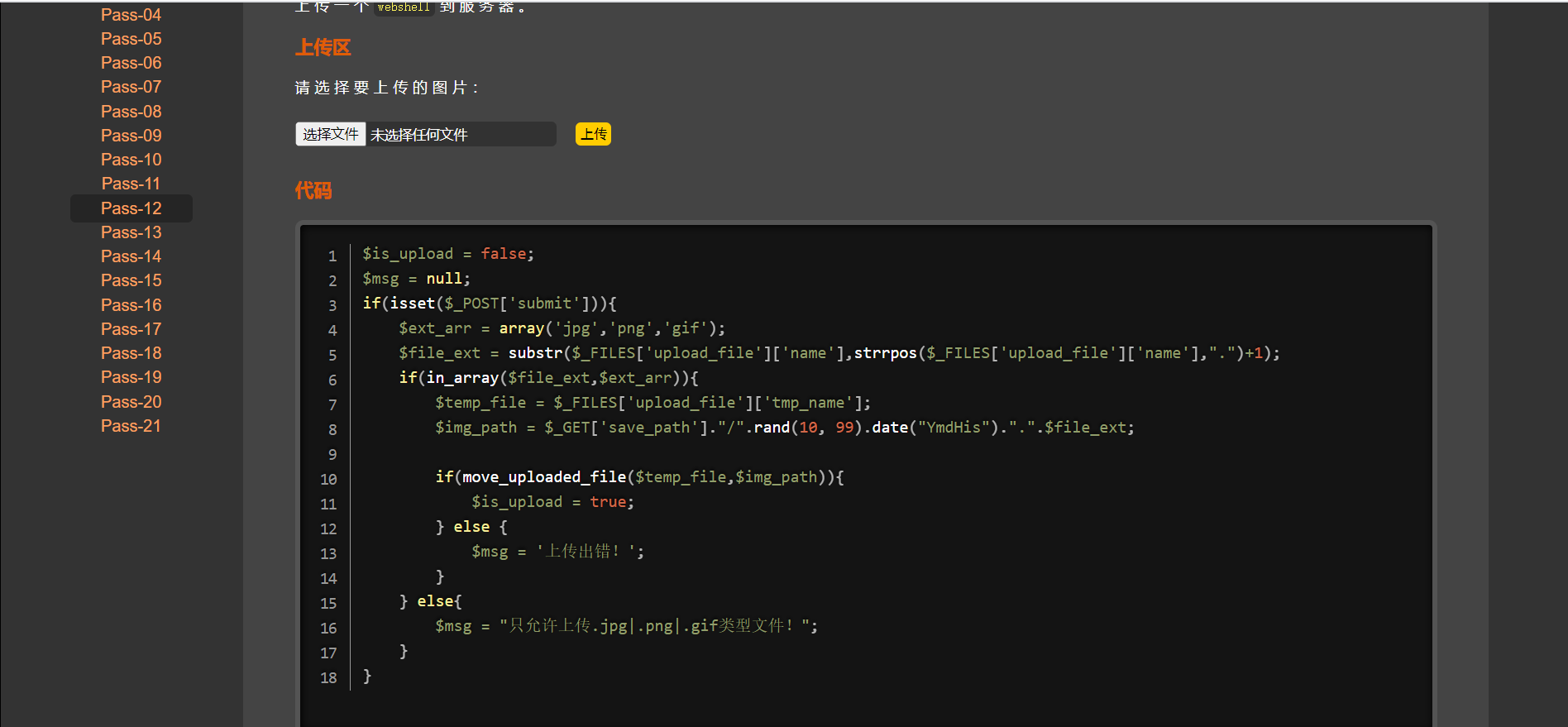 可以发现,这里与之前代码相比,使用了白名单,只允许上传,jpg,png,gif三种格式文件。