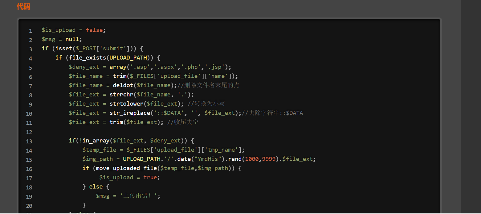 简单讲就是在php+windows的情况下:如果文件名+”::$DATA”会把::$DATA之后的数据当成文件流处理,不会检测后缀名.且保持”::$DATA”之前的文件名。