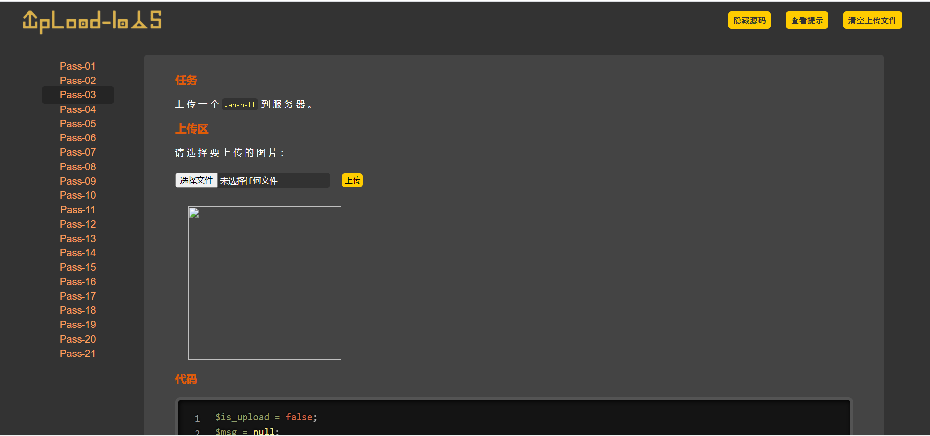 本关可以利用ini配置文件进行上传,先上传以auto_prepend_file=1.jpg为内容的.user.ini文件(所有的php文件都自动包含1.jpg文件。.user.ini相当于一个用户自定义的php.ini)然后再上传一句话的脚本,命名为1.jpg。访问即可。