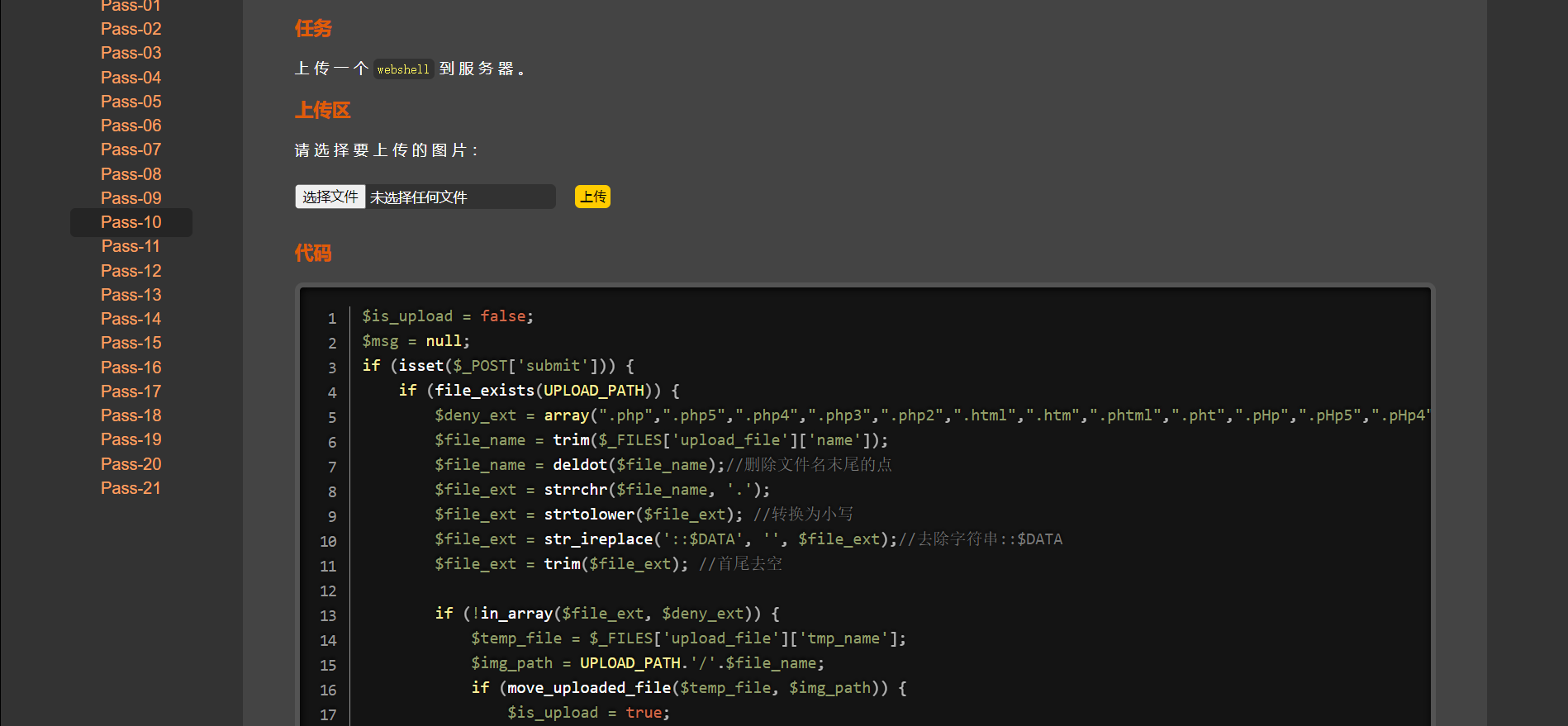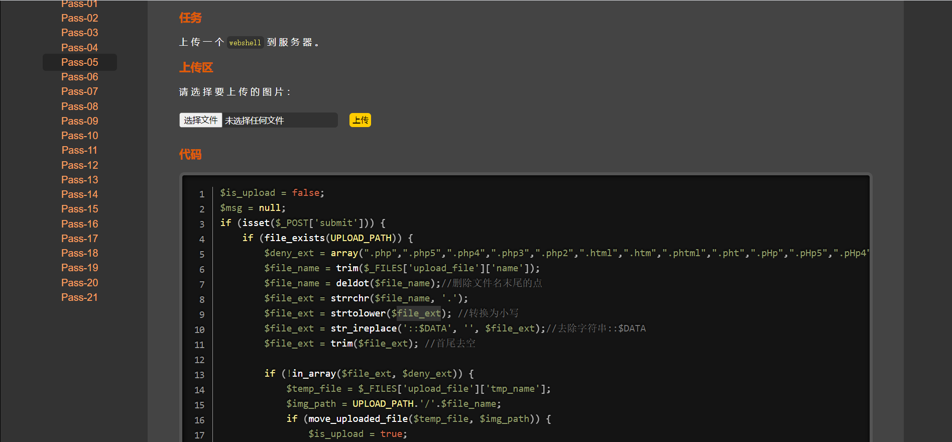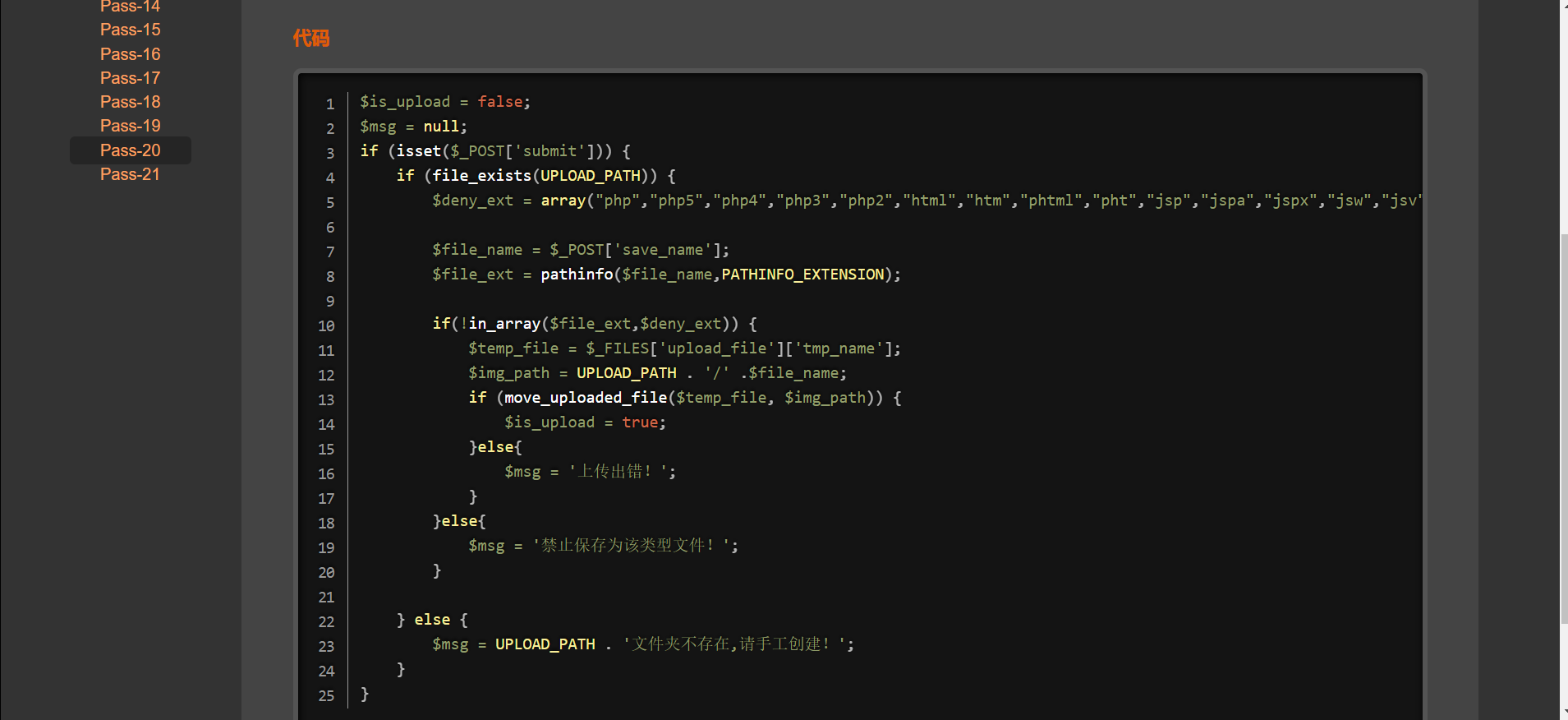 来看看源码,这回又是黑名单,只是禁用小写的文件名后缀,因此将文件名后缀大写即可绕过也可以在post save_name中在文件名后缀末添加空格即可通过。不过这关考的点应该是pathinfo