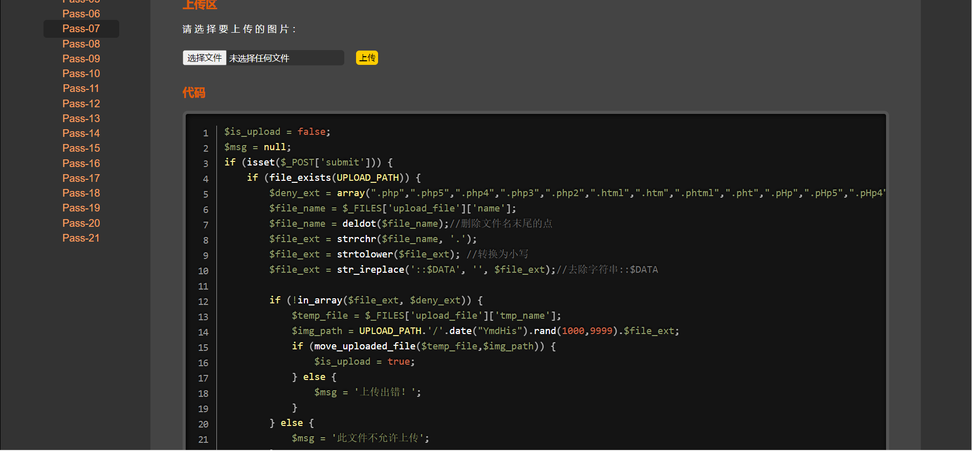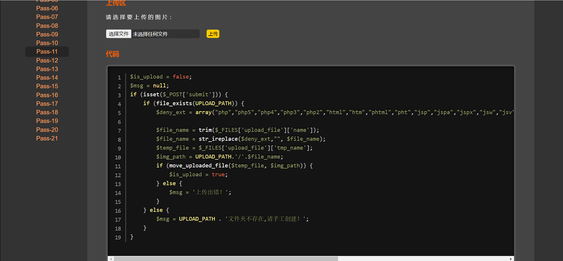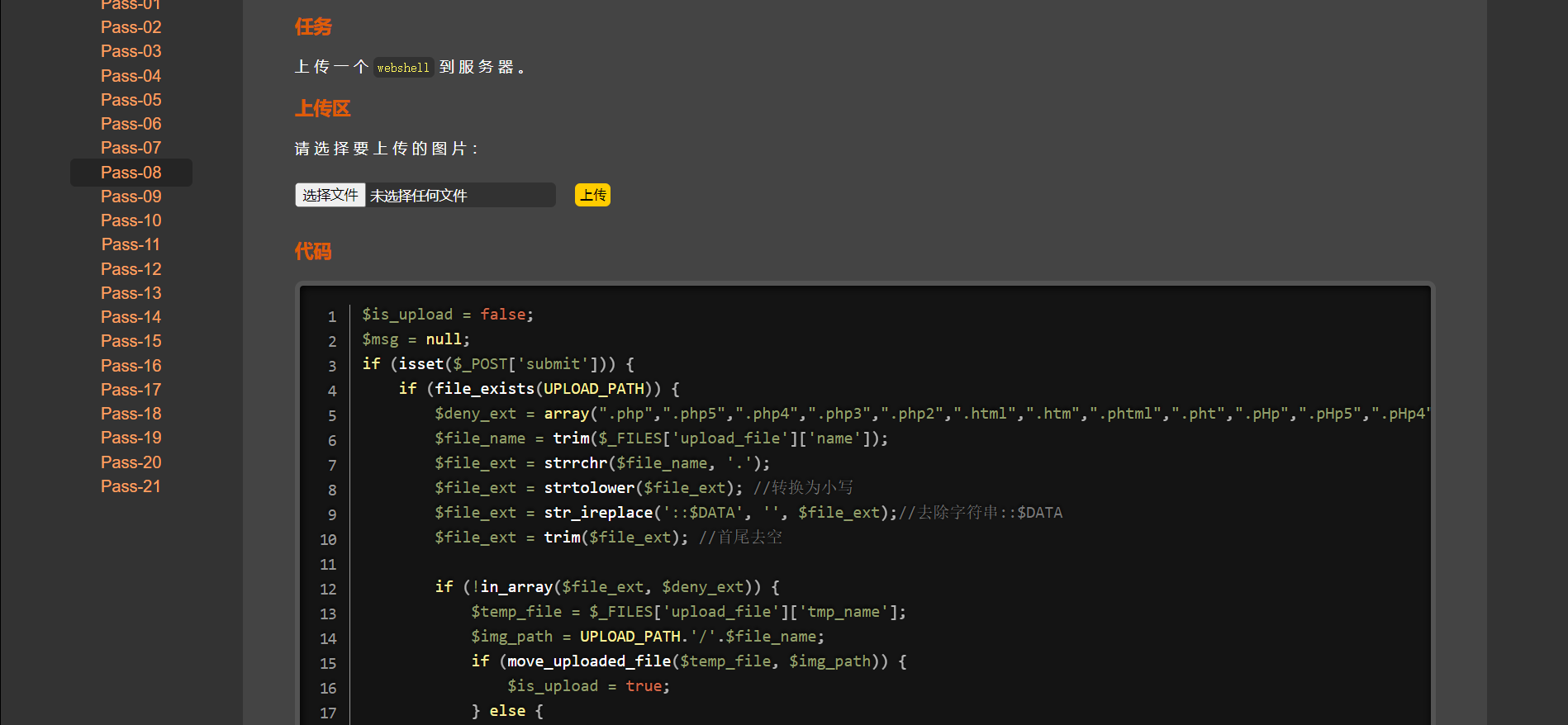 来看看源码,这回又是黑名单,只是禁用小写的文件名后缀,因此将文件名后缀大写即可绕过也可以在post save_name中在文件名后缀末添加空格即可通过。不过这关考的点应该是pathinfo