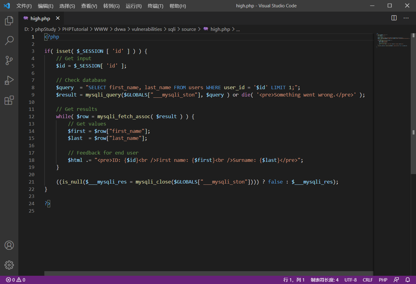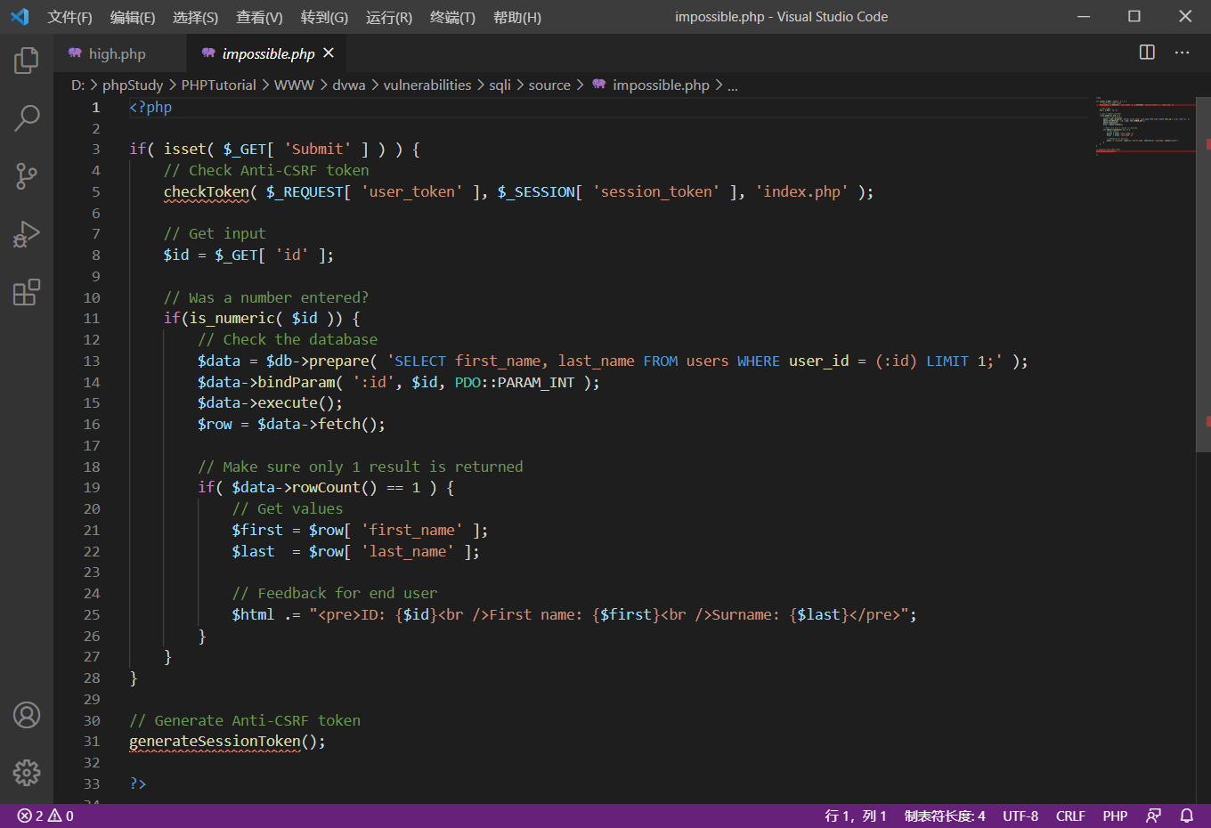 可以看到,Impossible级别的代码采用了PDO技术,划清了代码与数据的界限,有效防御SQL注入,同时只有返回的查询结果数量为一时,才会成功输出,这样就有效预防了“脱裤”,Anti-CSRFtoken机制的加入了进一步提高了安全性。