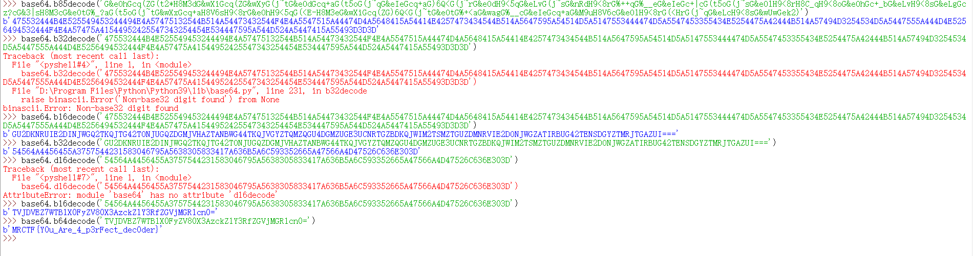 [MRCTF2020]pyFlag 三张图片尾有惊喜,可以拼成一个zip压缩包,爆破得密码为1234,然后真base套娃现场