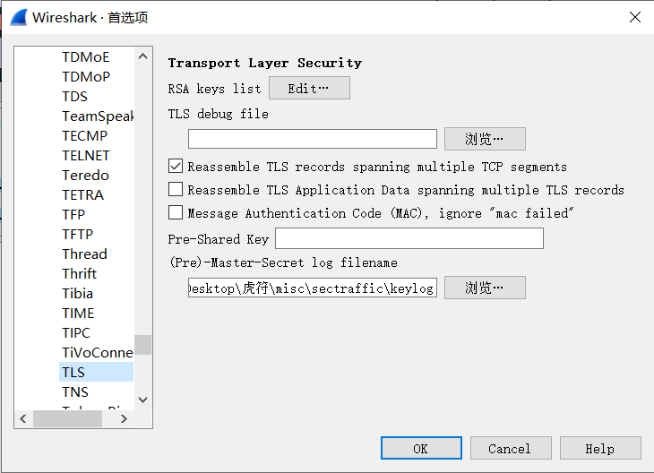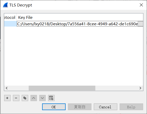 | 编辑->首选项->Protocols->TLS`,点击`Edit`,然后点击`+`添加`Key File
