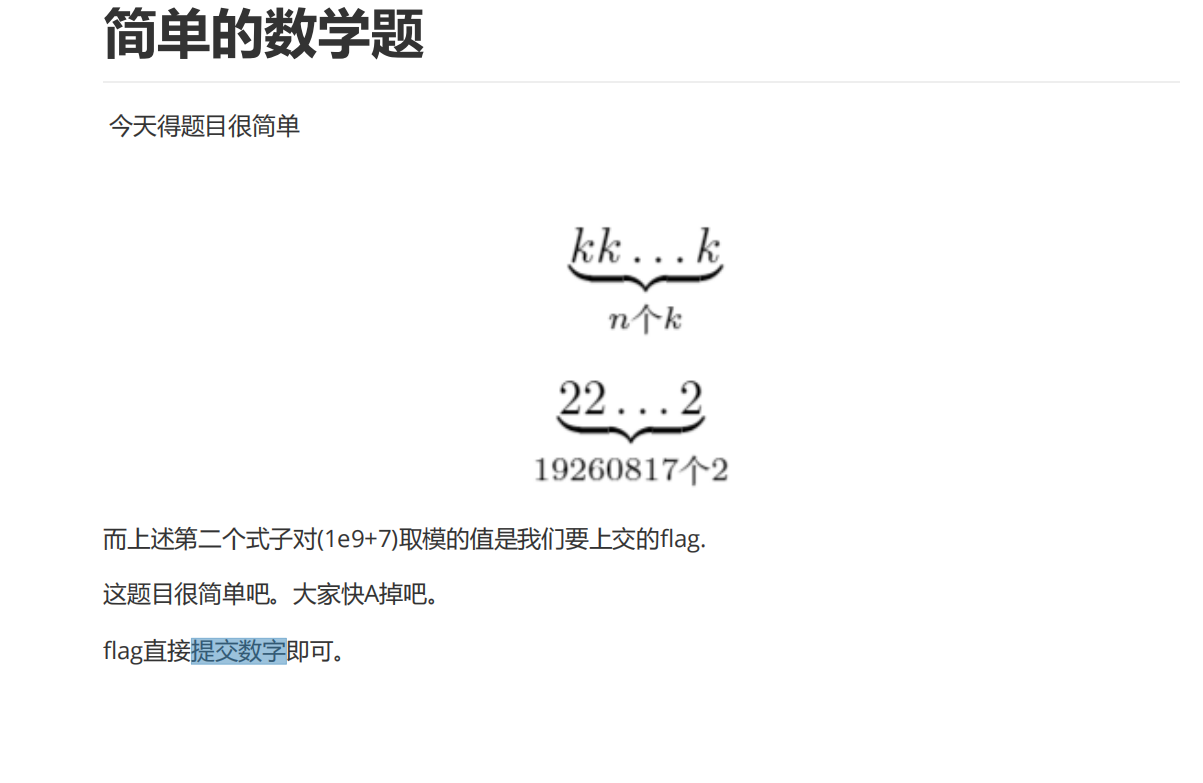 1 2 3 4 flag=0 for i in range(0 ,19260817 ): flag=(flag*10 +2 )%1000000007 print(flag)