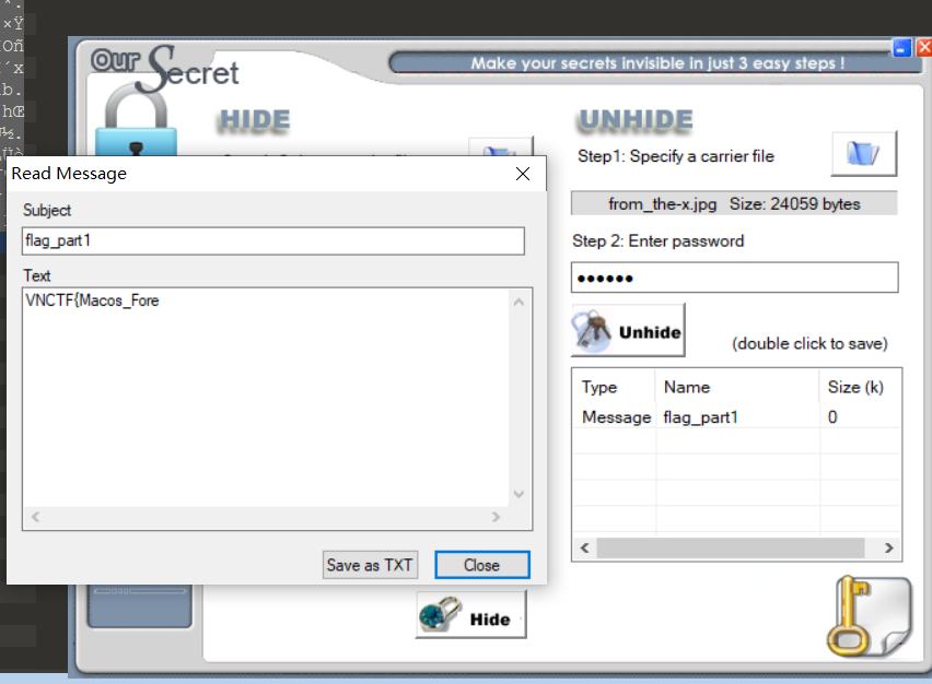 把后半部分的flag删掉用oursecret打开,密码这里考的是弱密码123456